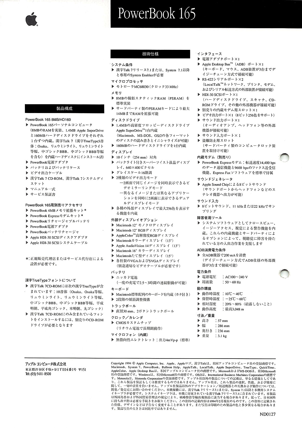 Apple PowerBook 165は、高性能でお求めやすいノート型コンピュータの新しい標準機種です。コンパクトなデザインで高性能を実現しており、既存のアプリケーションを最大限に利用することができます。